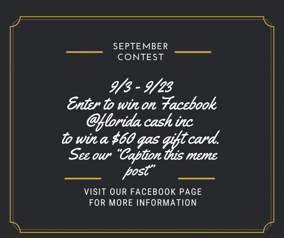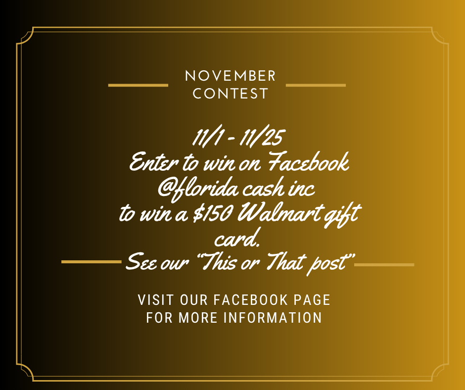 This all depends on the item. It may help to understand the difference between selling and pawning your item. Once you bring it to Florida Cash Inc., our experienced professionals will inspect it and place a value on it. If you sell it, you will take the cash, walk away, and the item(s) will be ours to resell. If you wish to pawn it for money, you will have to accept the terms and conditions, and we will get you the cash with the expectation that you will make the payments and collect the item(s) when finished. Should you decide not to make the payments, we will keep the collateral for reselling purposes.